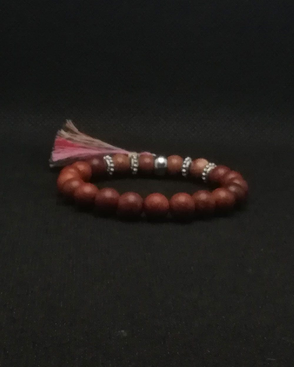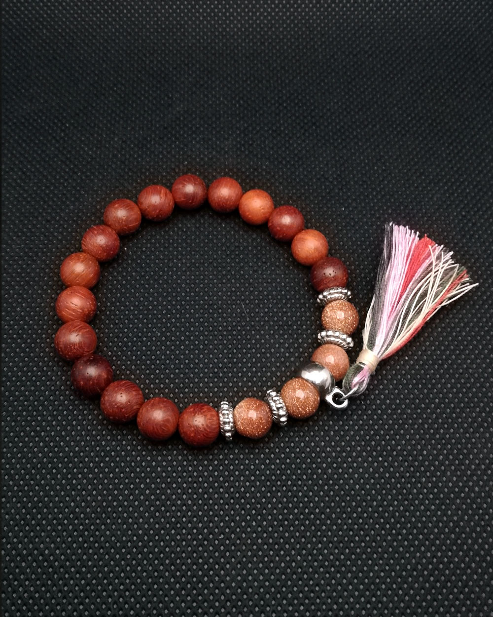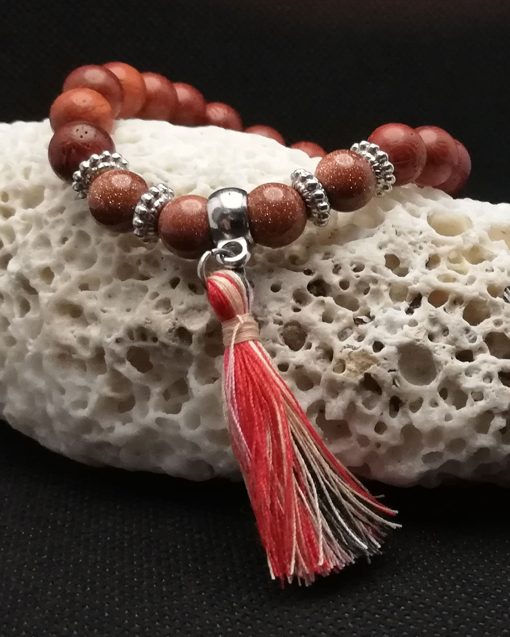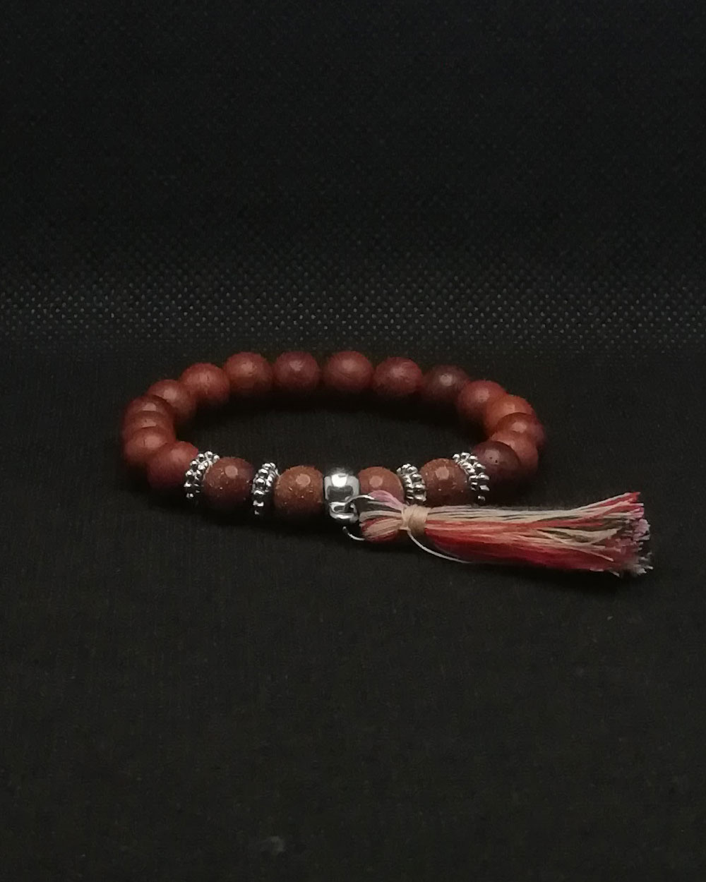 Pulseira feita em fio de silicone de 1 mm com contas 8 mm de madeira e pedra de Areia Dourada.