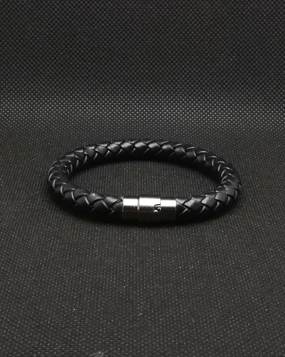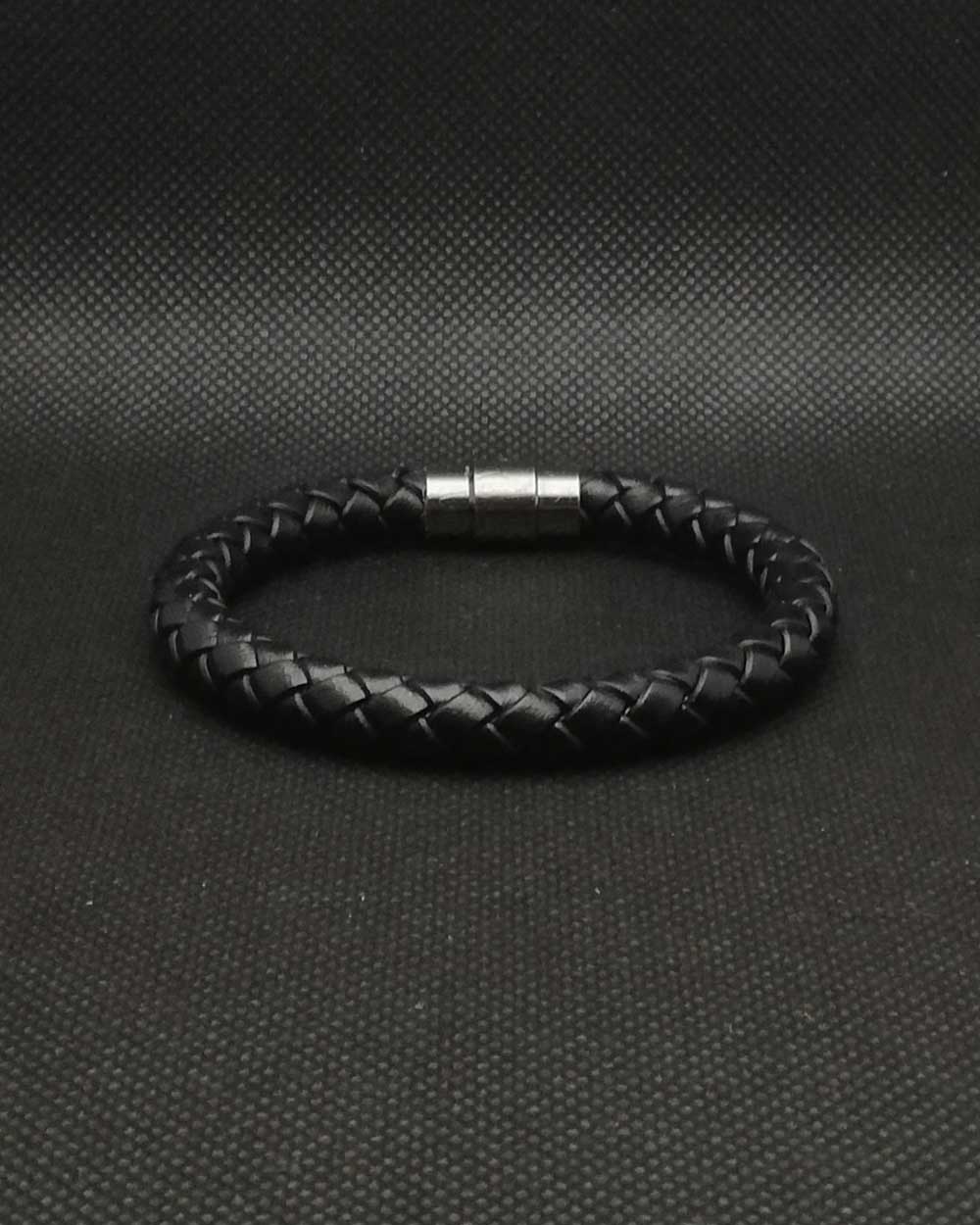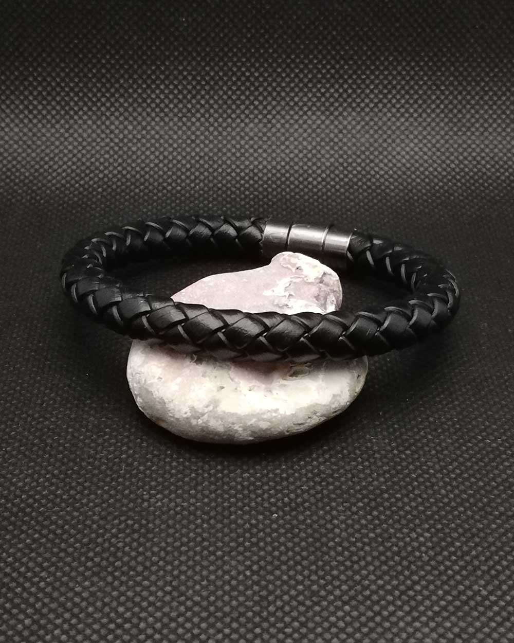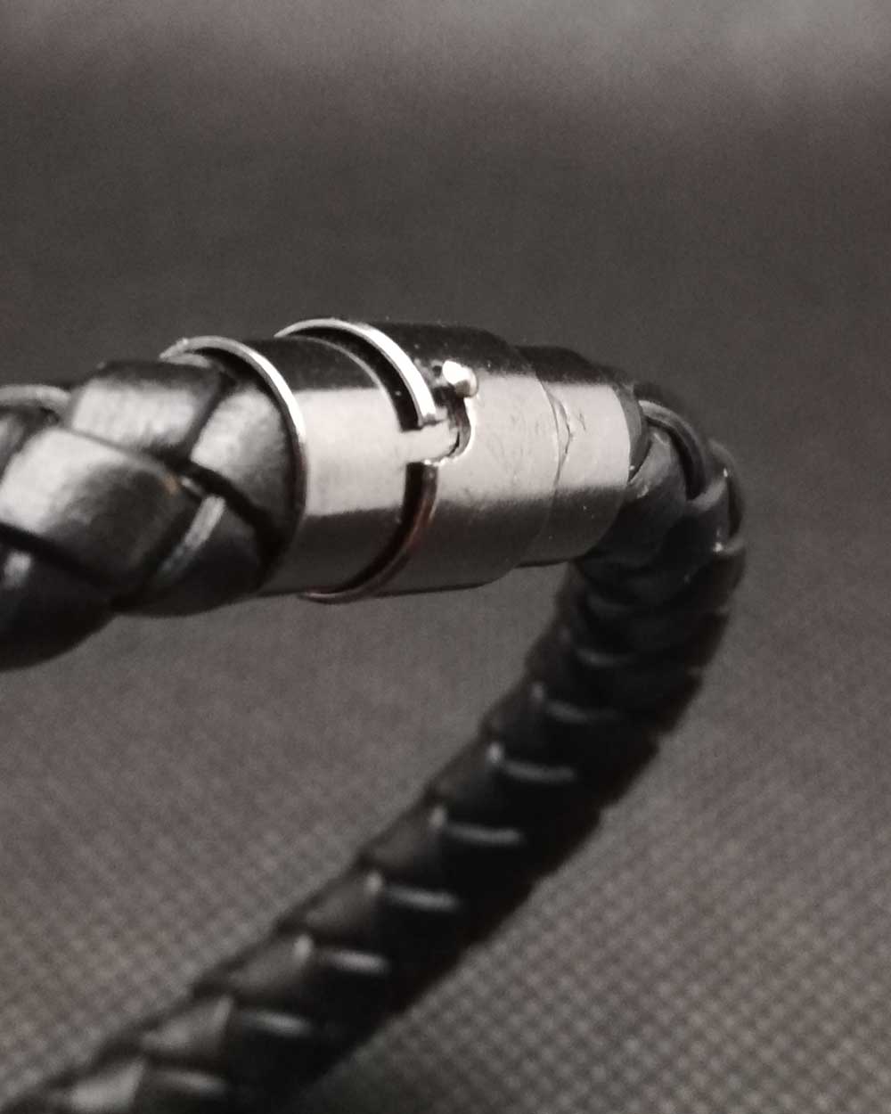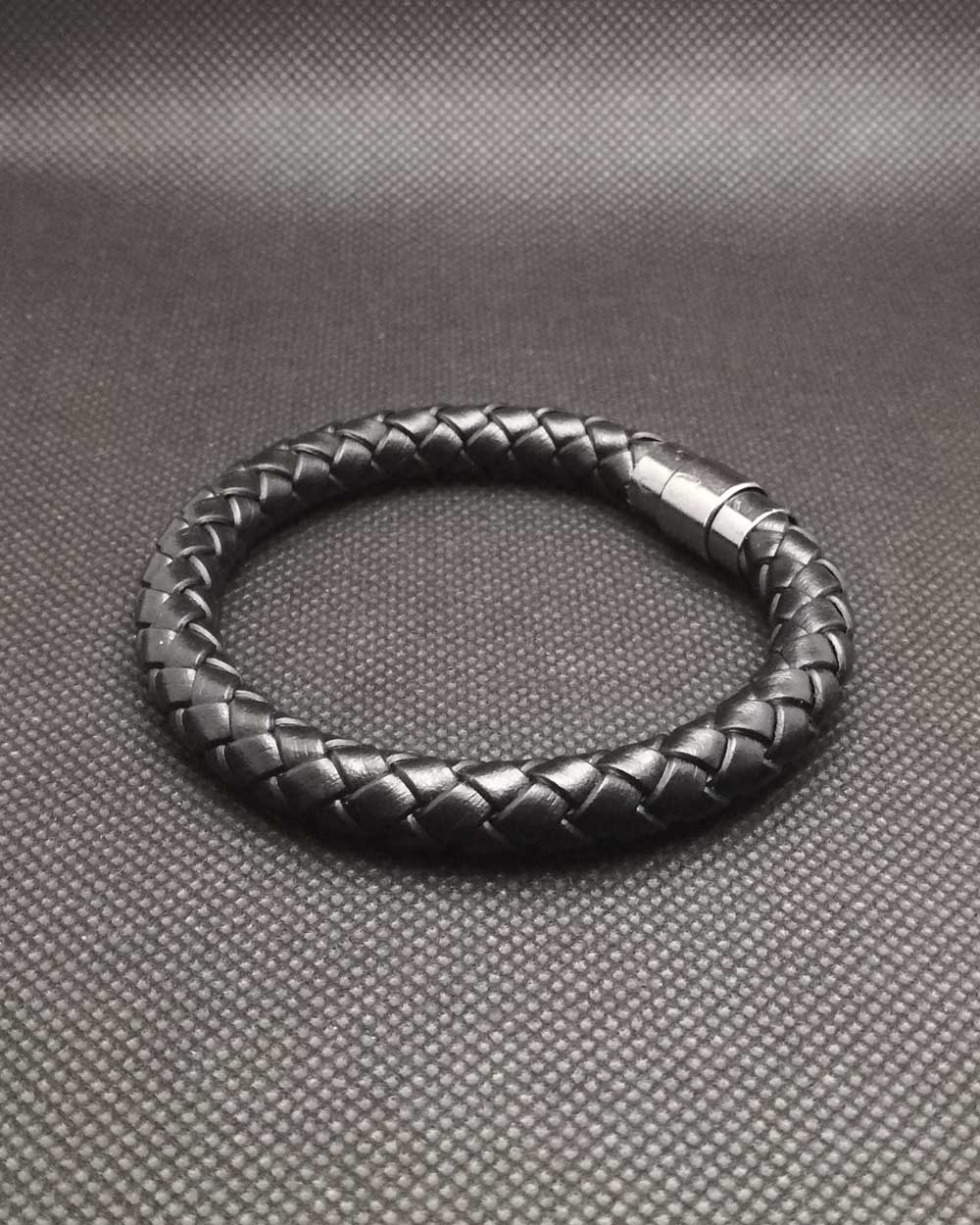 Pulseira feita em Couro trançado natural de 8 mm, preto, com fecho magnético cinza.