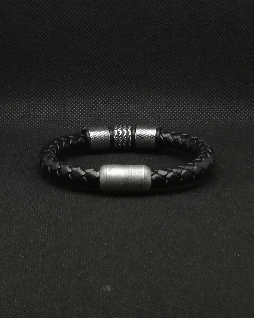 Pulseira feita em Couro trançado natural de 8 mm, em preto, com 3 contas largas de Aço inoxidável. Fecho magnético em Aço vintage.