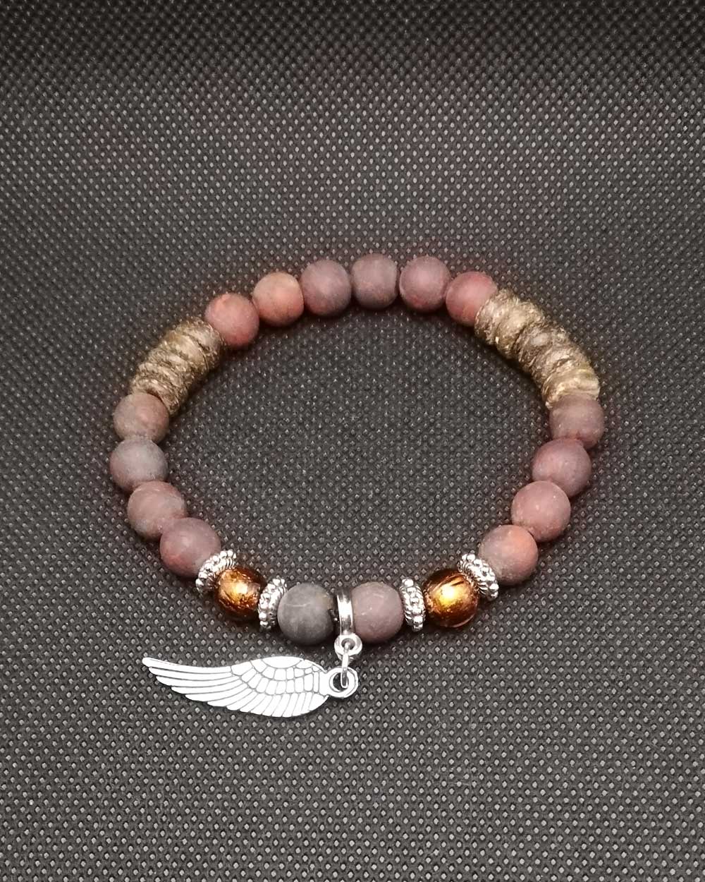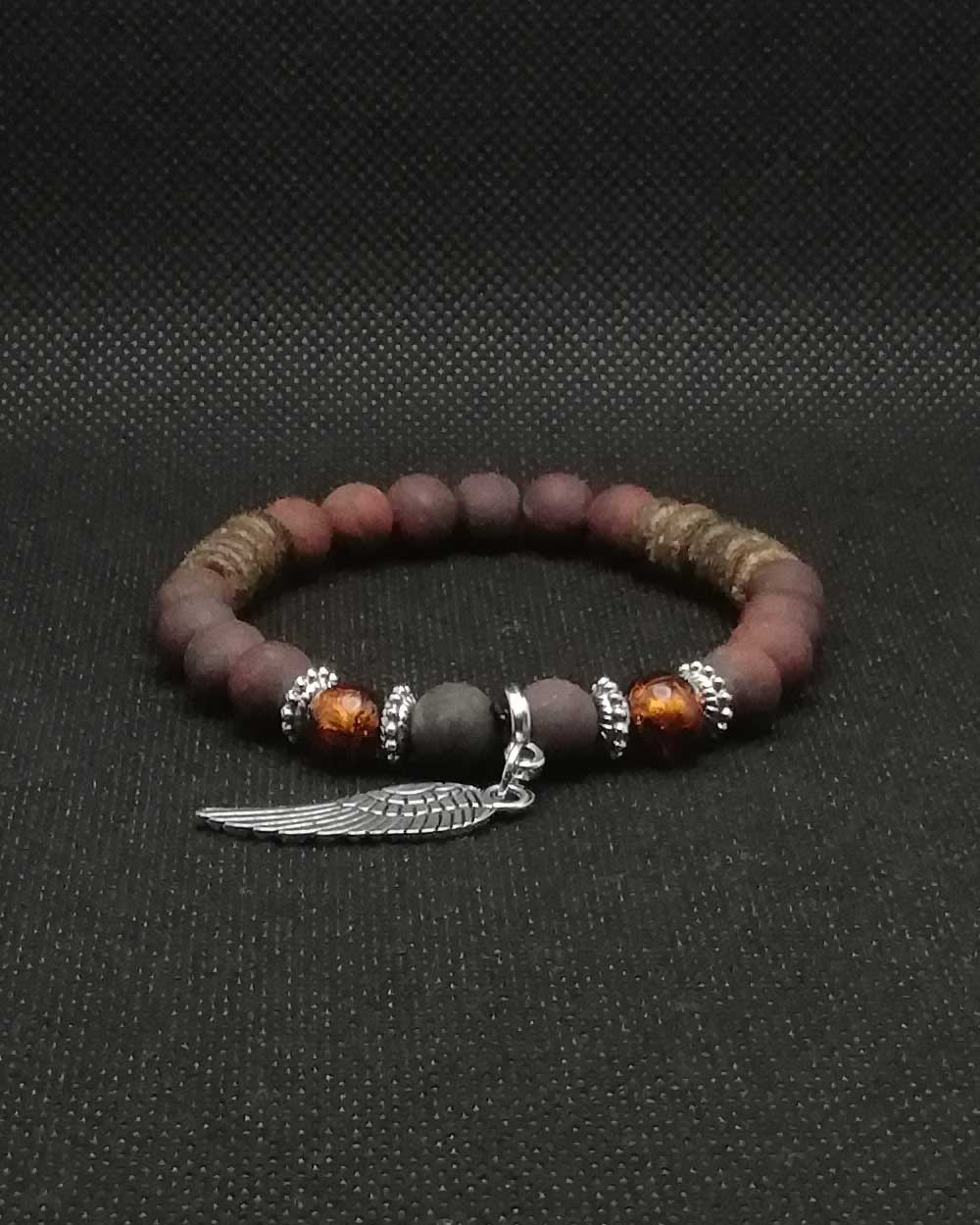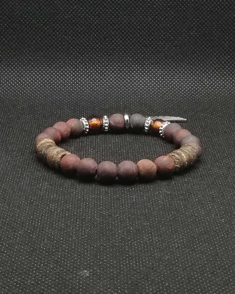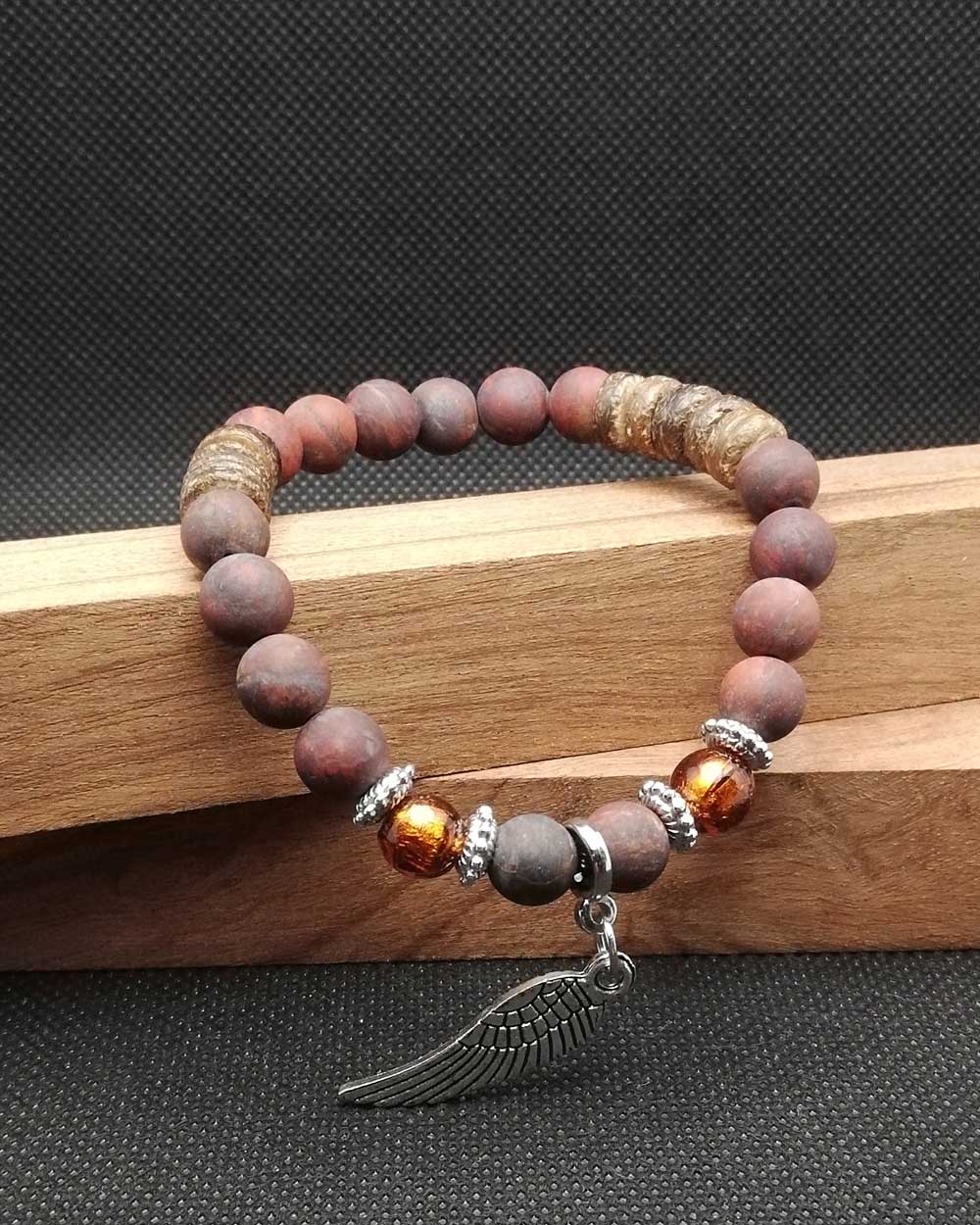 Pulseira de pedra Jaspe vermelha, vidro e espaçadores de madeira