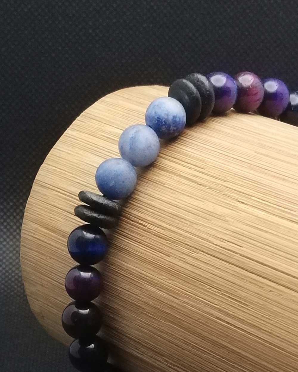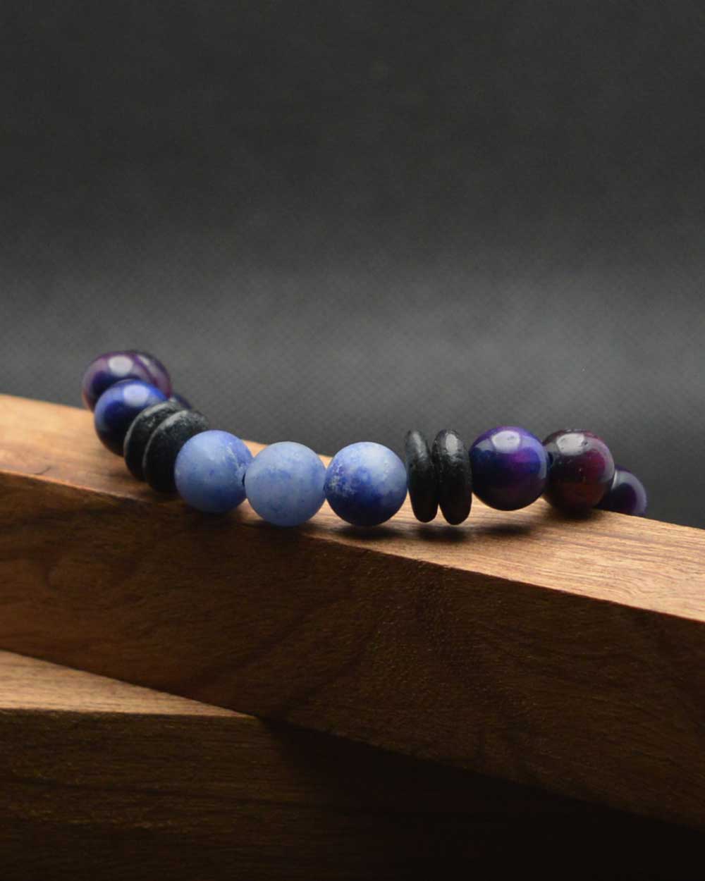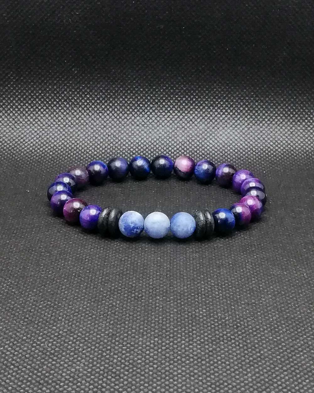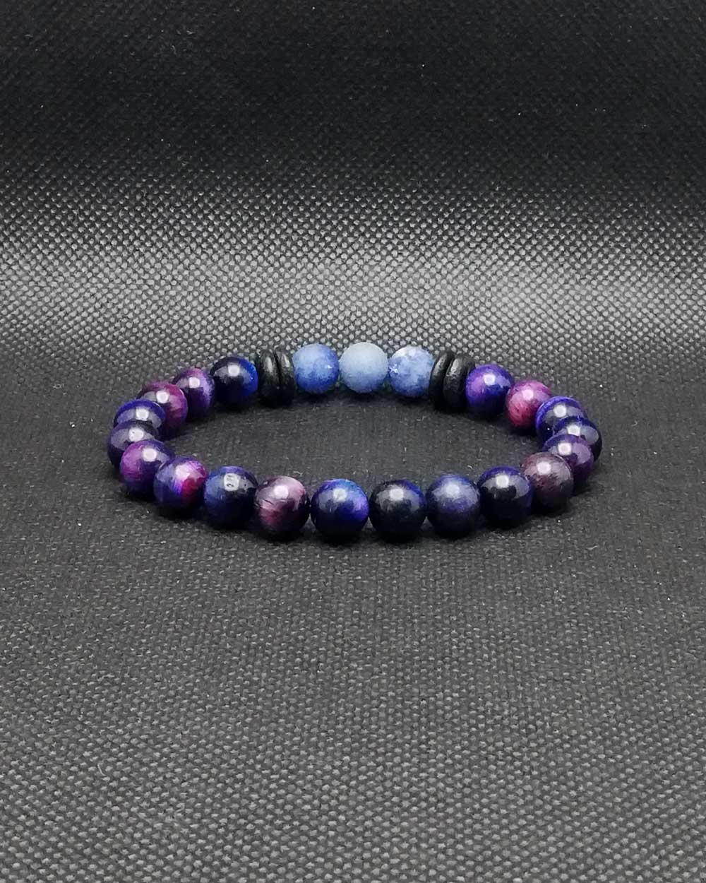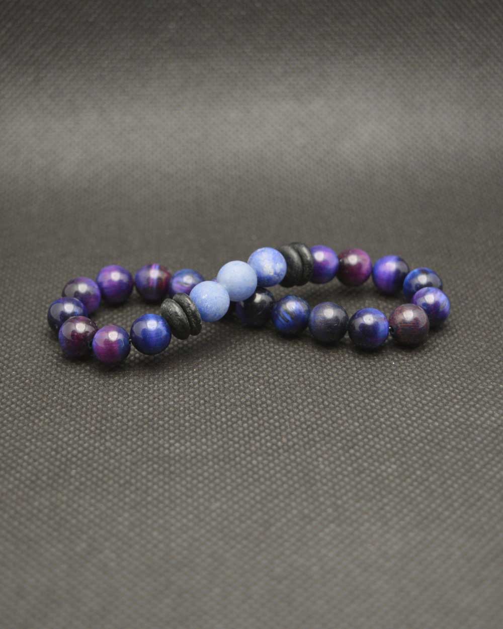 Pulseira feita em fio de silicone de 1 mm com contas 8 mm de pedra Rodusita (Olho de Tigre Azul) e Aventurina azul mate.